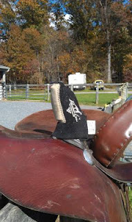 Sometimes you just have to make do with whatever is in the tack room. I have ordered a queen for my new saddle, but it hasn't arrived yet and I wanted to take it out for a hack. Fighting the saddle for correct position certainly didn't appeal to me and there wasn't any vet wrap to hand, so in a flash of inspiration I took one of Owen's fetlock boots and fastened it around the upright horn.